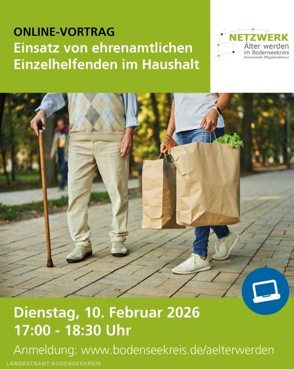 Am Dienstag, 10. Februar 2026 um 17:00 Uhr sind pflegebedürftige Menschen, Angehörige und Interessierte zu einem kostenlosen Online-Vortrag zum Thema „Einsatz von ehrenamtlichen Einzelhelfenden im Haushalt“ eingeladen. Im Rahmen der viel beachteten Vortragsreihe des Netzwerks „Älter werden im Bodenseekreis“ erklärt Felix Brummund von der AOK Bodensee-Oberschwaben praxisnah, welche Voraussetzungen gelten und wie die Abrechnung mit der Pflegekasse funktioniert. Denn die Pflege eines Angehörigen ist eine anspruchsvolle Aufgabe. Um den Alltag zu erleichtern, steht pflegebedürftigen Menschen ein monatlicher Entlastungsbetrag von 131 Euro zu. In Baden-Württemberg können diese Leistungen nun auch für Hilfen aus der Nachbarschaft, dem Freundes- oder Bekanntenkreis genutzt und bei der Pflegekasse abgerechnet werden. Im Vortrag wird erklärt, was bei der Abrechnung mit den Kassen zu beachten ist.